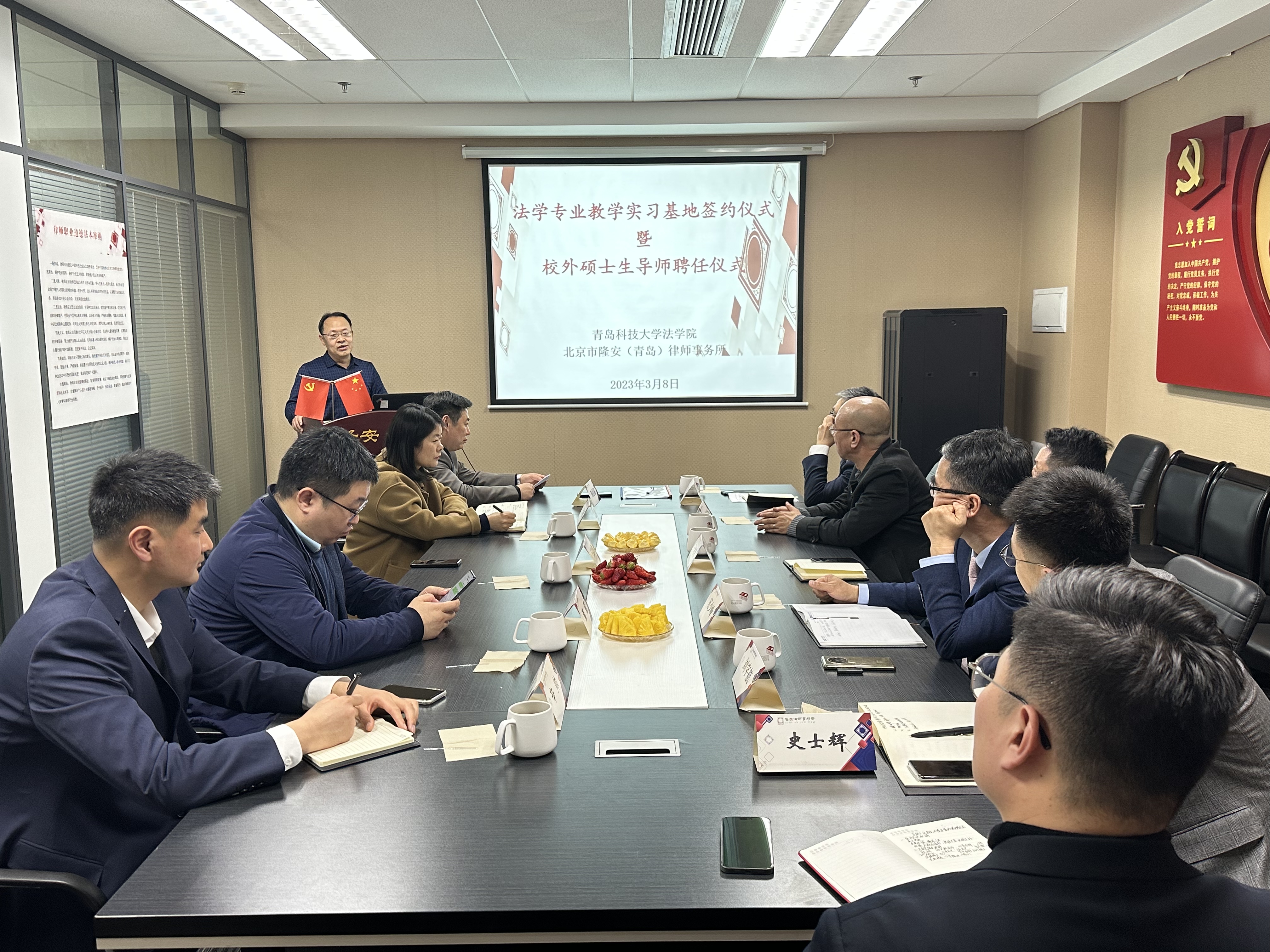 3月8日下午,青島科技大學法學院與北京市隆安(青島)律師事務所共建法學專業(yè)實踐教學基地簽約儀式暨校外碩士生導師聘任儀式在隆安青島律師事務所會議室舉行。法學院院長王金堂、黨總支副書記兼副院長王祥梅、法律系主任兼院長助理綦磊、經(jīng)濟法教研室主任辛帥,隆安青島律師事務所黨支部書記、主任于鴻章及執(zhí)行主任焦成龍等參加儀式。
