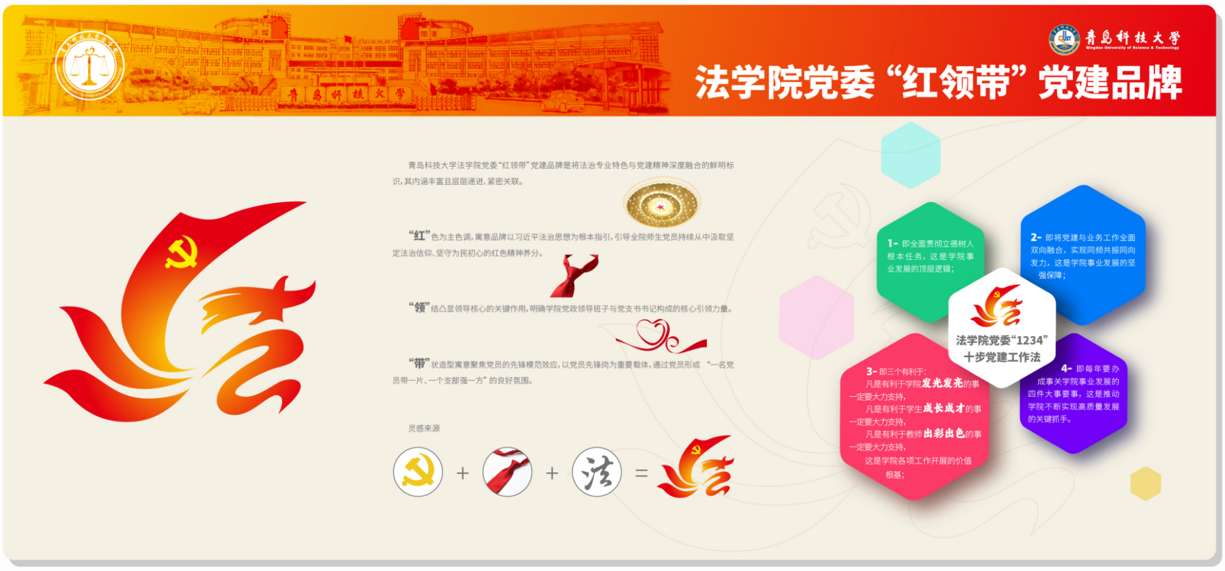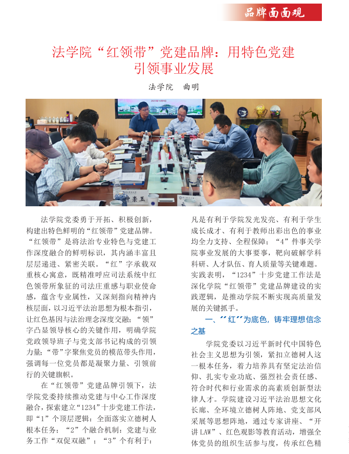 法學(xué)院黨委勇于開拓、積極創(chuàng)新,構(gòu)建出特色鮮明的“紅領(lǐng)帶”黨建品牌。“紅領(lǐng)帶”是將法治專業(yè)特色與黨建工作深度融合的鮮明標(biāo)識,其內(nèi)涵豐富且 層層遞進(jìn)、緊密關(guān)聯(lián)。“紅”字承載雙重核心寓意,既精準(zhǔn)呼應(yīng)司法系統(tǒng)中紅色領(lǐng)帶所象征的司法莊重感與職業(yè)使命感,蘊含專業(yè)屬性,又深刻指向精神內(nèi)核層面,以習(xí)近平法治思想為根本指引, 讓紅色基因與法治理念深度交融;“領(lǐng)”字凸顯領(lǐng)導(dǎo)核心的關(guān)鍵作用,明確學(xué)院 黨政領(lǐng)導(dǎo)班子與黨支部書記構(gòu)成的引領(lǐng) 力量;“帶”字聚焦黨員的模范帶頭作用,強調(diào)每一位黨員都是凝聚力量、引領(lǐng)前行的關(guān)鍵旗幟。