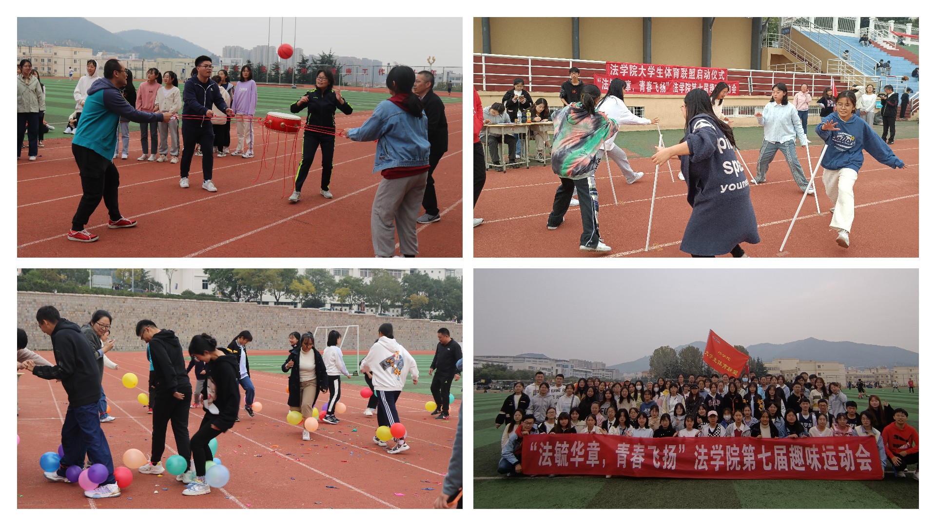 隨后,“法毓華章,青春飛揚(yáng)”第七屆趣味運(yùn)動會正式開始。趣味運(yùn)動會共設(shè)置踩氣球、鼓動人心、背投沙包等6個項(xiàng)目。比賽場上,學(xué)院工會教師代表隊與學(xué)生參賽隊伍同臺競技,各參賽隊隊員齊心協(xié)力,相互合作,屢創(chuàng)佳績,比賽精彩紛呈。場外的同學(xué)吶喊助威,現(xiàn)場氣氛熱烈。