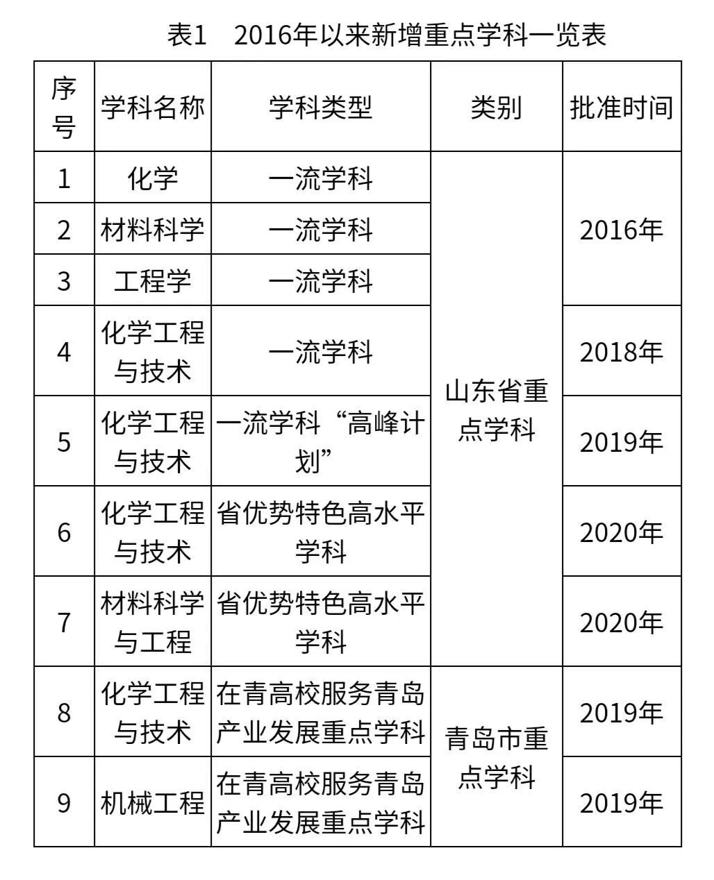 2016年化學(xué)、材料科學(xué)、工程學(xué)3個學(xué)科入選山東省重點(diǎn)建設(shè)“一流學(xué)科”行列;2018年化學(xué)工程與技術(shù)入選省一流學(xué)科,并于2019年入選省一流學(xué)科“高峰計(jì)劃”A類學(xué)科;2020年化學(xué)工程與技術(shù)、材料科學(xué)與工程2個學(xué)科入選山東省“優(yōu)勢特色”類高水平學(xué)科,學(xué)校入選山東省“強(qiáng)特色”類高水平大學(xué);2019年化學(xué)工程與技術(shù)、機(jī)械工程入選在青高校服務(wù)青島產(chǎn)業(yè)發(fā)展重點(diǎn)學(xué)科(表1)。目前我校US News世界學(xué)科排名上榜7個學(xué)科,化學(xué)工程與技術(shù)位列第102位。在全國第四輪學(xué)科評估中,學(xué)校有9個學(xué)科進(jìn)入前70%,其中化學(xué)工程與技術(shù)為B+,省屬高校工科唯一(表2)。