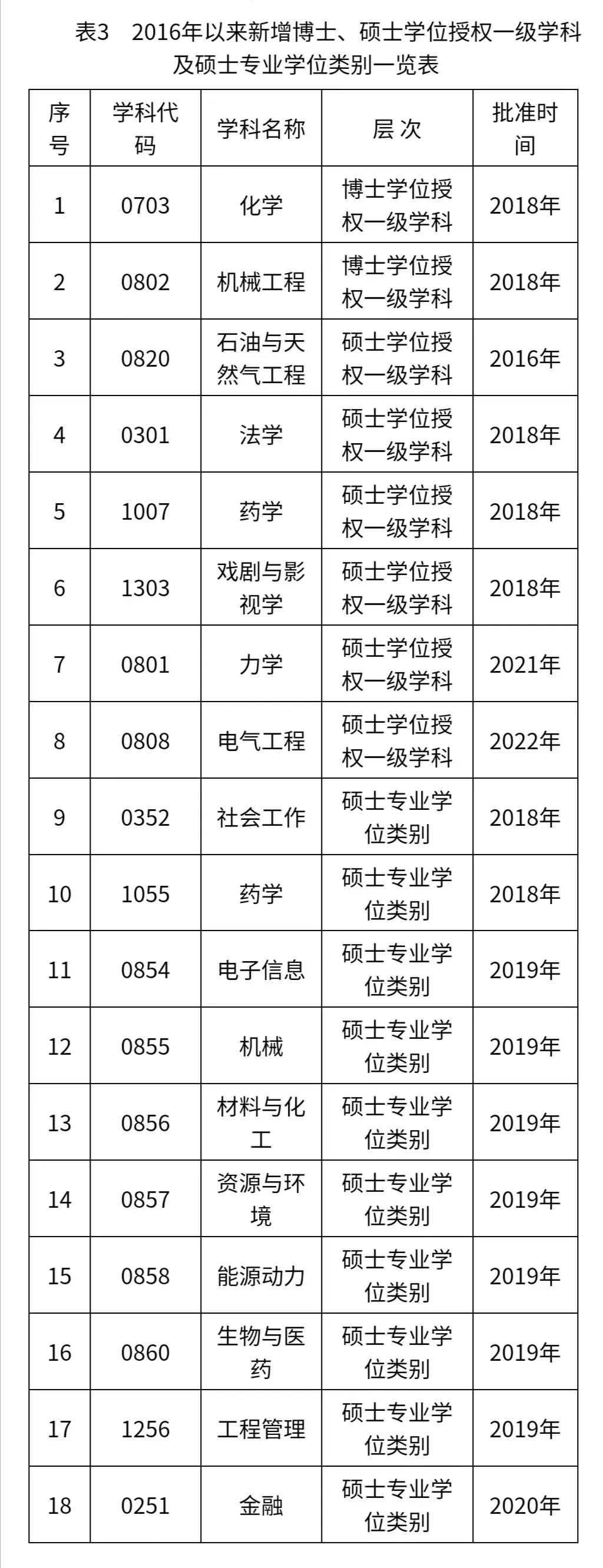 自2016年以來,學(xué)校獲批化學(xué)、機(jī)械工程2個博士學(xué)位授權(quán)一級學(xué)科,法學(xué)、藥學(xué)、戲劇與影視學(xué)、力學(xué)、電氣工程5個碩士學(xué)位授權(quán)一級學(xué)科,社會工作、藥學(xué)2個碩士專業(yè)學(xué)位類別。在工程碩士專業(yè)學(xué)位授權(quán)點(diǎn)對應(yīng)調(diào)整工作中,將12個工程領(lǐng)域調(diào)整成電子信息、機(jī)械、材料與化工、資源與環(huán)境、能源動力、生物與醫(yī)藥、工程管理7個專業(yè)學(xué)位類別。學(xué)校堅(jiān)持“有所不為”原則,主動撤銷發(fā)展前景不好的精密儀器及機(jī)械、情報(bào)學(xué)2個碩士學(xué)位授權(quán)點(diǎn),對應(yīng)調(diào)整增列石油與天然氣工程、金融2個碩士學(xué)位授權(quán)點(diǎn)(表3)。截至目前,學(xué)校共有5個博士學(xué)位授權(quán)一級學(xué)科,24個碩士學(xué)位授權(quán)一級學(xué)科,16個碩士專業(yè)學(xué)位類別,實(shí)現(xiàn)了各教學(xué)學(xué)院碩士一級學(xué)科授權(quán)點(diǎn)全覆蓋。