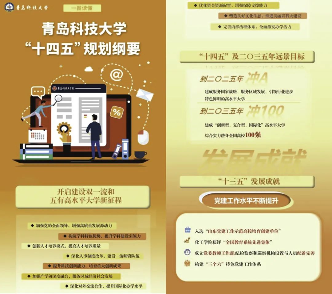 立足“十四五”開新局,學(xué)校制定了《“十四 五”發(fā)展規(guī)劃和二〇三五年遠(yuǎn)景目標(biāo)綱要》,明確了建成“服務(wù)國(guó)家戰(zhàn)略、服務(wù)區(qū)域發(fā)展,引領(lǐng)行業(yè)進(jìn)步特色鮮明的高水平大學(xué)”的發(fā)展目標(biāo),并從發(fā)展基礎(chǔ)與發(fā)展環(huán)境,指導(dǎo)思想、遵循原則與主要目標(biāo),主要任務(wù)與思路舉措,組織實(shí)施四個(gè)方面進(jìn)行了闡釋。明確了加強(qiáng)黨的全面領(lǐng)導(dǎo)、增強(qiáng)高質(zhì)量發(fā)展源動(dòng)力,構(gòu)筑學(xué)科特色優(yōu)勢(shì)、提升學(xué)科建設(shè)引領(lǐng)力,創(chuàng)新人才培養(yǎng)模式、提高人才培養(yǎng)質(zhì)量,深化人事制度改革、建設(shè)一流師資隊(duì)伍,提升科技創(chuàng)新能力、培育重大創(chuàng)新成果,加強(qiáng)產(chǎn)學(xué)研深度融合、服務(wù)區(qū)域發(fā)展,深化對(duì)外交流合作、提升國(guó)際化辦學(xué)水平,優(yōu)化資金資源配置、增強(qiáng)保障支撐能力,塑造良好文化生態(tài)、推進(jìn)美麗青科大建設(shè),完善內(nèi)部治理體系、全面激發(fā)辦學(xué)活力等十個(gè)方面的任務(wù)和措施。為學(xué)校未來(lái)五年乃至更長(zhǎng)時(shí)期的戰(zhàn)略規(guī)劃、事業(yè)發(fā)展的總體目標(biāo)、主要任務(wù)和重大舉措提供基本遵循,進(jìn)行頂層設(shè)計(jì),成為全校師生員工共同奮斗的目標(biāo)引領(lǐng)。