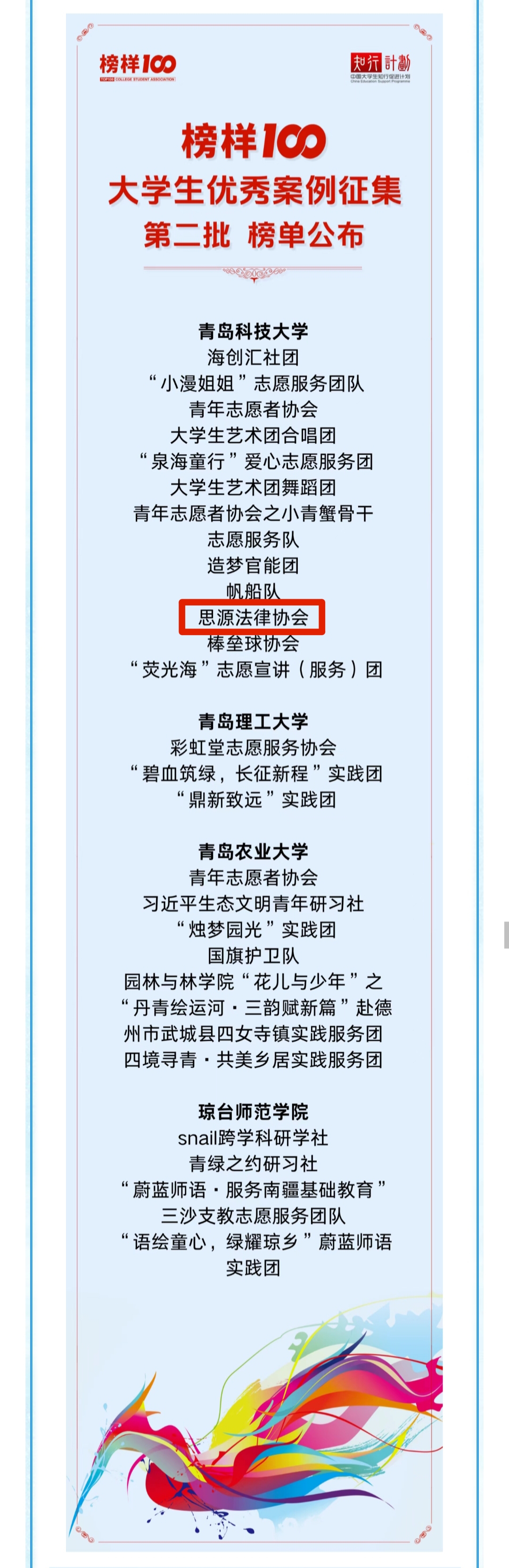 近日,2025年度“榜樣100”大學(xué)生優(yōu)秀案例征集入選榜單正式公布,法學(xué)院思源法律協(xié)會(huì)活動(dòng)案例成功入選,獲評(píng)全國(guó)大學(xué)生優(yōu)秀案例。