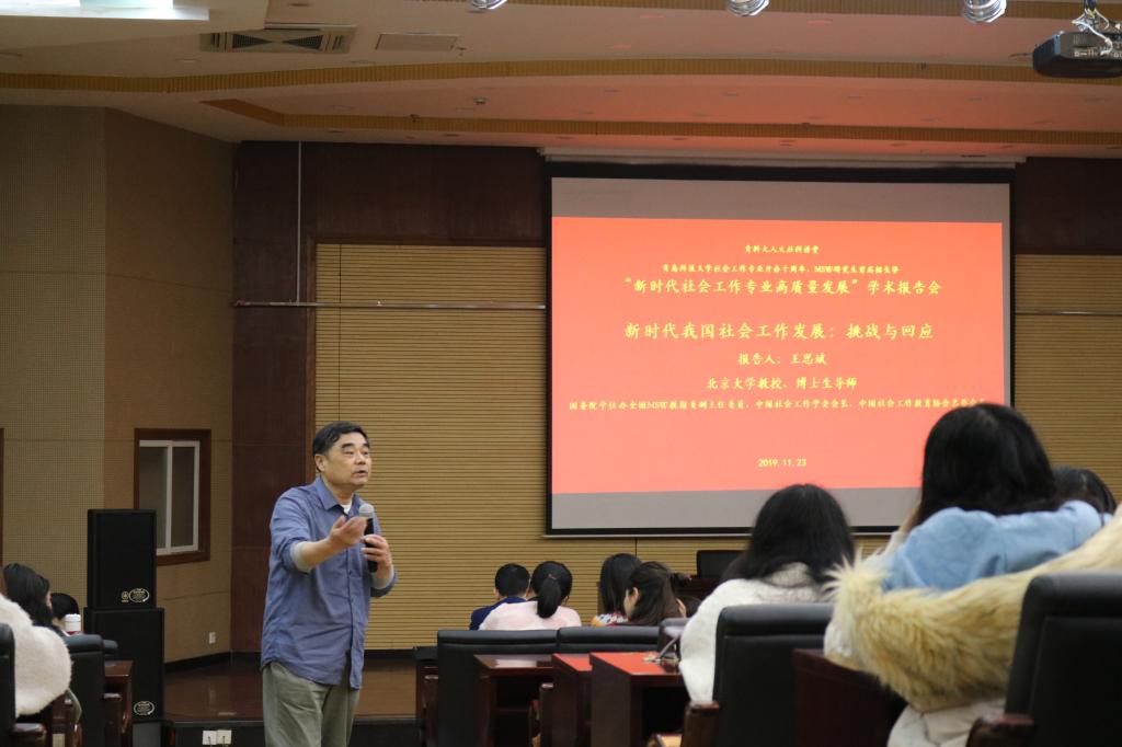 11月23日,“新時代社會工作專業(yè)高質(zhì)量發(fā)展”學(xué)術(shù)研討會在嶗山校區(qū)綜合服務(wù)樓3015會議室和第一報告廳舉行。全國社會工作專業(yè)學(xué)位研究生教育指導(dǎo)委員會原副主任委員、中國社會工作學(xué)會會長、中國社會工作教育協(xié)會名譽會長、北京大學(xué)王思斌教授,全國社會工作專業(yè)學(xué)位研究生教育指導(dǎo)委員會副主任委員、中國社會工作學(xué)會副會長、中國社會工作教育協(xié)會副會長、復(fù)旦大學(xué)文科處處長顧東輝教授,山東省社會工作協(xié)會會長、山東大學(xué)高鑒國教授等專家出席研討會。青島科技大學(xué)副校長劉光燁出席會議并致辭。