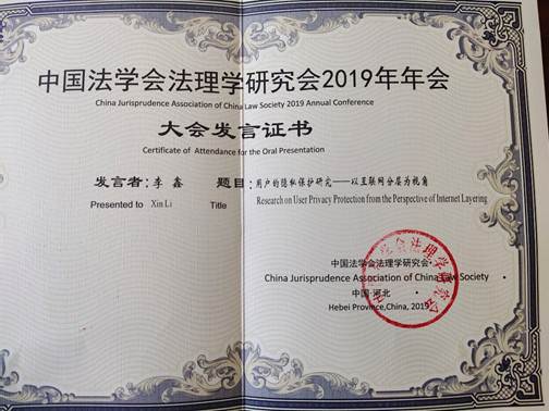 9月21-22日,由中國法學會法理學研究會主辦,河北經(jīng)貿(mào)大學法學院與地方法治建設(shè)研究中心承辦的中國法學會法理學研究會2019年年會暨“中國法理學的新使命和新發(fā)展”學術(shù)研討會在石家莊召開。中國法學會副會長、全國人大監(jiān)察和司法委員會副主任委員、教育部法學教學指導委員會主任徐顯明教授,中國法學會法理學研究會會長、中國社會科學院學部委員李林教授,河北省高級人民法院副院長王越飛,河北省人民檢察院副檢察長何秉群,河北省法學會副會長馮憲軍等出席,來自中國人民大學、中國政法大學、西南政法大學、青島科技大學等高校的270余位理論界與實務(wù)界專家學者和師生參加。我院副教授、副院長李鑫老師參會,并以《用戶的隱私保護研究——以互聯(lián)網(wǎng)分層為視角》為題作了大會發(fā)言。
