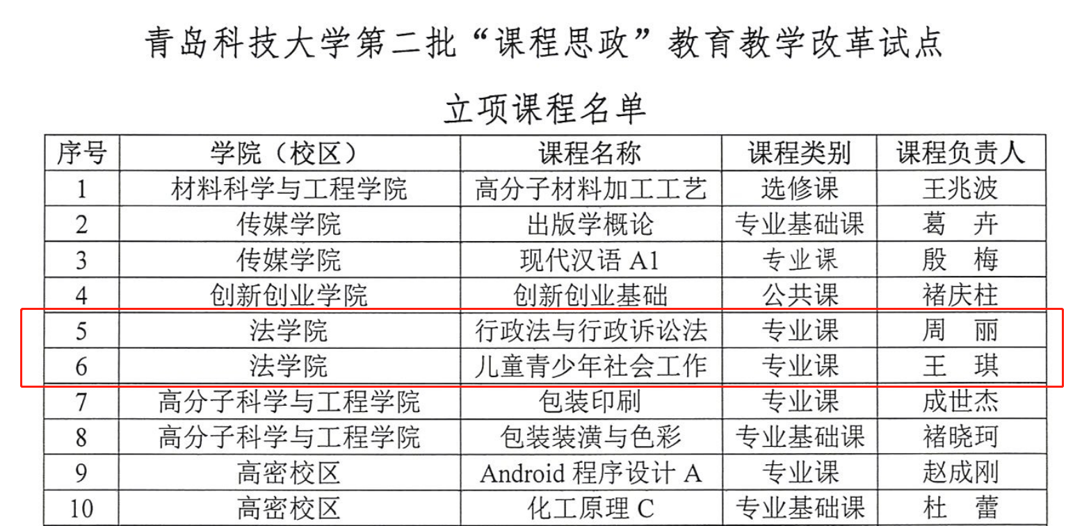 為全面推動我校“課程思政”教育教學(xué)改革,教務(wù)處于2019年11月啟動了第二批“課程思政”教育教學(xué)改革試點(diǎn)課程校級立項(xiàng)申報工作。根據(jù)《關(guān)于開展青島科技大學(xué)第二批“課程思政教育教學(xué)改革試點(diǎn)課程申報工作的通知》要求,經(jīng)個人申報、學(xué)院推薦、教務(wù)處審定,確定32 門課程作為第二批校級“課程思政”教育教學(xué)改革試點(diǎn)立項(xiàng)課程。我院2門課程入校。